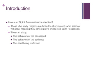 This presentation by Bekah Rigby explores the concept of spirit possession, defining it as a ritual where participants act as mediums for invisible forces, typically in public forums. It examines the behaviors and rituals associated with spirit possession across various cultures and religions, highlighting its historical significance and purpose within indigenous societies. The document also contrasts modern Western views on spirit possession, framing it as often regarded as strange or a symptom of mental illness.