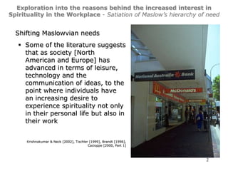 The document explores the rising interest in workplace spirituality, highlighting factors such as the quest for meaning and purpose, changes in the global economy, and the collapse of traditional community structures. It discusses various perspectives on spirituality, differentiating it from religion and suggesting its potential benefits for employee fulfillment and organizational performance. Additionally, it presents survey data on beliefs, occupations, and demographics of respondents related to spirituality in the workplace.
