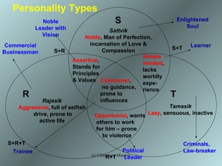 The document introduces spirituality in the workplace. It discusses different personality types and their traits, intentions, thoughts, actions, and reactions. It provides guidance on developing detachment and noble intentions at work through practicing karma yoga and following teachings from the Bhagavad Gita. It also discusses how to recognize a good leader, develop wise attitudes, and maintain work-life balance.