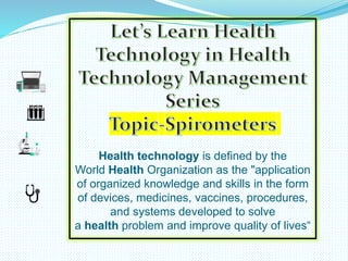 Health technology encompasses devices and systems designed to address health issues and improve life quality, as defined by the WHO. Spirometry is a pulmonary function test that measures air inhalation and exhalation, utilizing different types of spirometers, and provides critical data for diagnosing respiratory conditions. Proper maintenance and troubleshooting of spirometers are essential for accurate measurements and user safety.