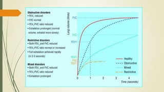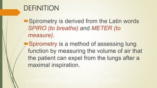 Spirometry is a test that measures lung function by having the patient forcefully exhale air into a mouthpiece. It was originally developed in the 1840s and has since been improved with electronic devices. It is used to diagnose asthma and COPD by measuring airflow obstruction. The test involves withholding some medications beforehand, having the patient blow hard into the device multiple times, and may show a normal pattern or patterns indicating obstruction, restriction, or both. Reversibility testing with a bronchodilator helps distinguish asthma from COPD. Spirometry provides important information about lung health and disease.