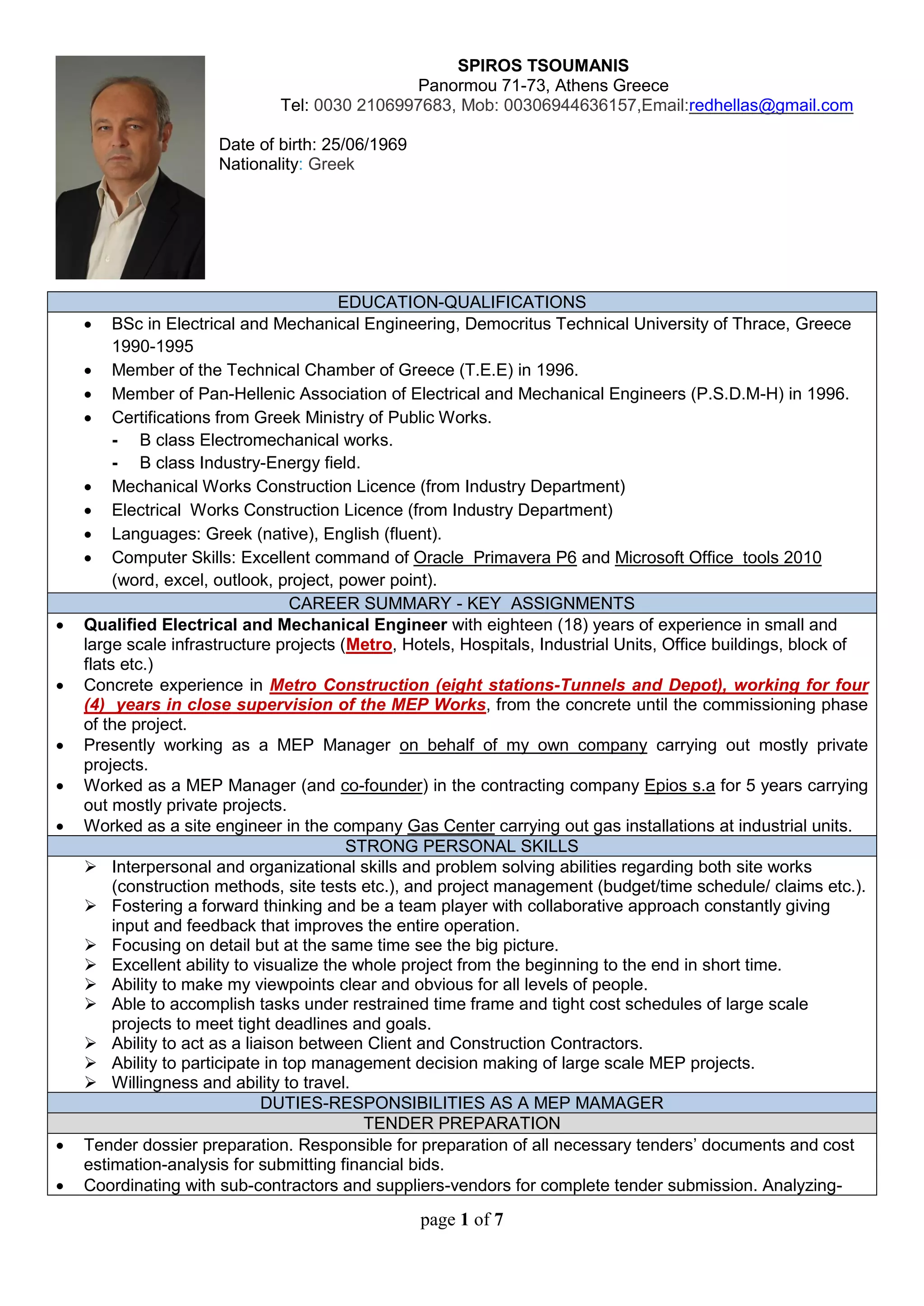 Spiros Tsoumanis has over 18 years of experience as a mechanical and electrical engineer, working on infrastructure projects including metro stations, hotels, hospitals, and office buildings. He is currently working independently as an MEP Manager on private projects. His responsibilities have included tender preparation, design coordination, planning, procurement, subcontractor management, quality assurance, health and safety oversight, and project closeout. He has extensive experience managing MEP works for a variety of commercial, industrial, and public sector clients.