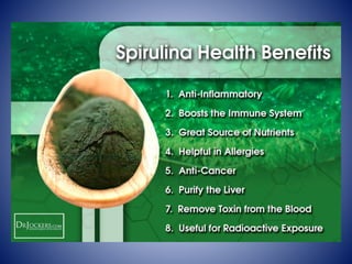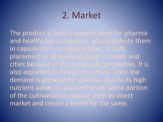 This document provides information on Anbu Farms, which cultivates Spirulina. Spirulina is a type of blue-green algae that is used as a health food and nutritional supplement. Anbu Farms produces 4000 kg of Spirulina powder per year through cultivation, harvesting, drying and processing. The Spirulina powder is packaged and sold to pharmaceutical companies and also exported.