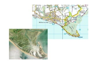 A spit is a landform created by the deposition of sediment transported by longshore drift. Sediment is carried along the coast until the direction changes, causing deposition and the formation of a curved spit. Over time, the deposited sediment builds up in layers from mudflats to salt marsh and eventually freshwater marsh. As wind directions change, the end of the spit may curve further, forming hooked shapes. Spits can grow across river mouths or bays, diverting rivers or connecting islands to mainland via tombolos.