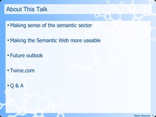 The speaker discusses the semantic web and its potential to make data on the web smarter and more connected. He outlines several approaches to semantics like tagging, statistics, linguistics, semantic web, and artificial intelligence. The semantic web allows data to be self-describing and linked, enabling applications to become more intelligent. The speaker demonstrates a prototype semantic web application called Twine that helps users organize and share information about their interests.