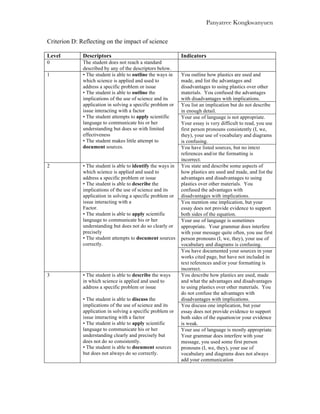The essay discusses how plastics are made from oil and chemicals, the advantages of plastics being inexpensive and versatile compared to other materials, and the environmental issues caused by plastic waste not degrading and polluting oceans. It examines both sides of whether plastics should continue to be used or if alternatives should be researched further due to their environmental impacts.