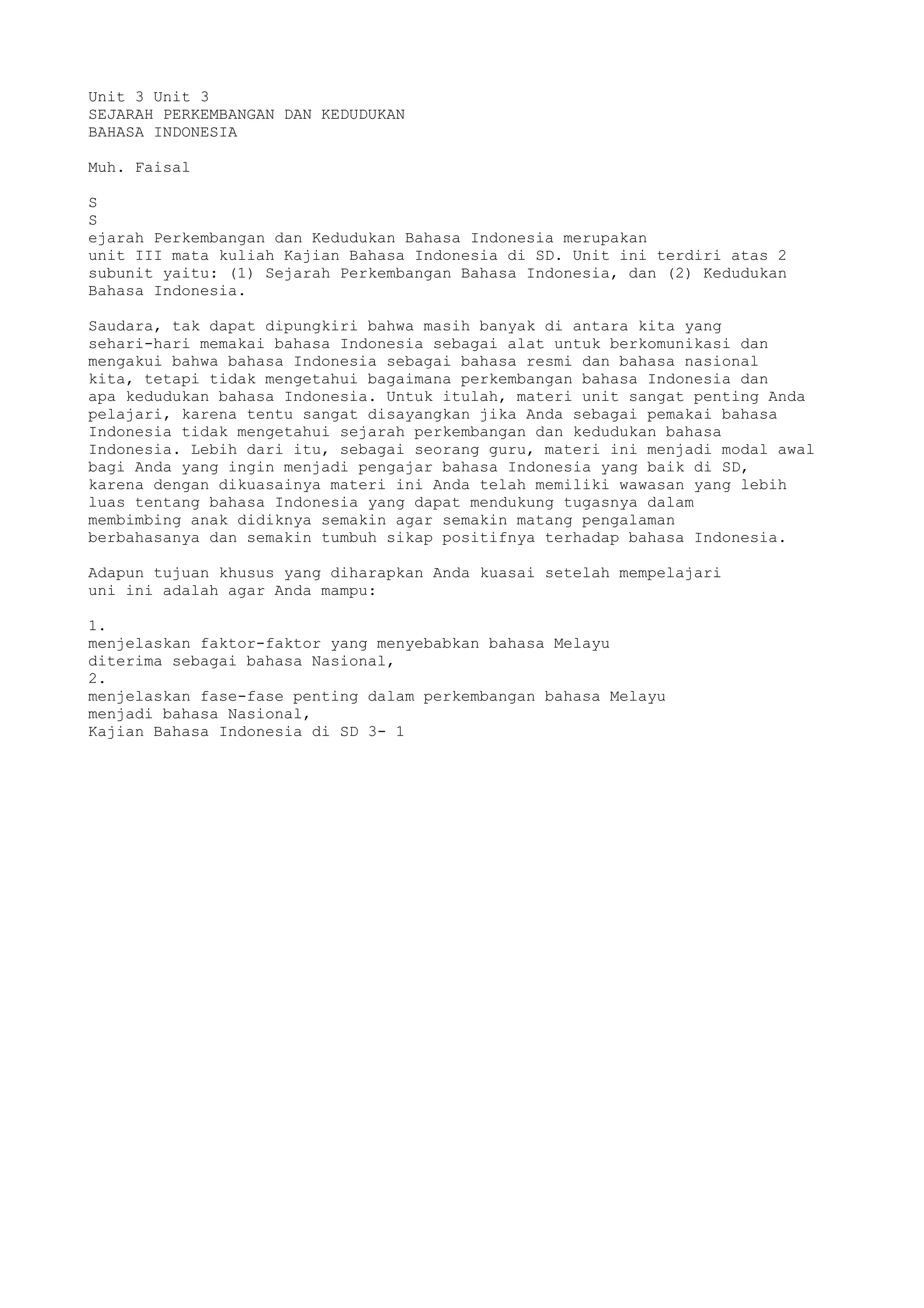 Unit ini membahas sejarah perkembangan bahasa Indonesia dari bahasa Melayu hingga menjadi bahasa nasional, dan faktor-faktor yang mendorong pemilihan bahasa Melayu. Bahasa Melayu dipilih karena telah digunakan sebagai bahasa pergaulan dan perdagangan, serta memiliki sistem bahasa yang lebih sederhana dibanding bahasa daerah lain. Bahasa Indonesia kemudian berkembang melalui pengajaran di sekolah dan tulisan wartaw