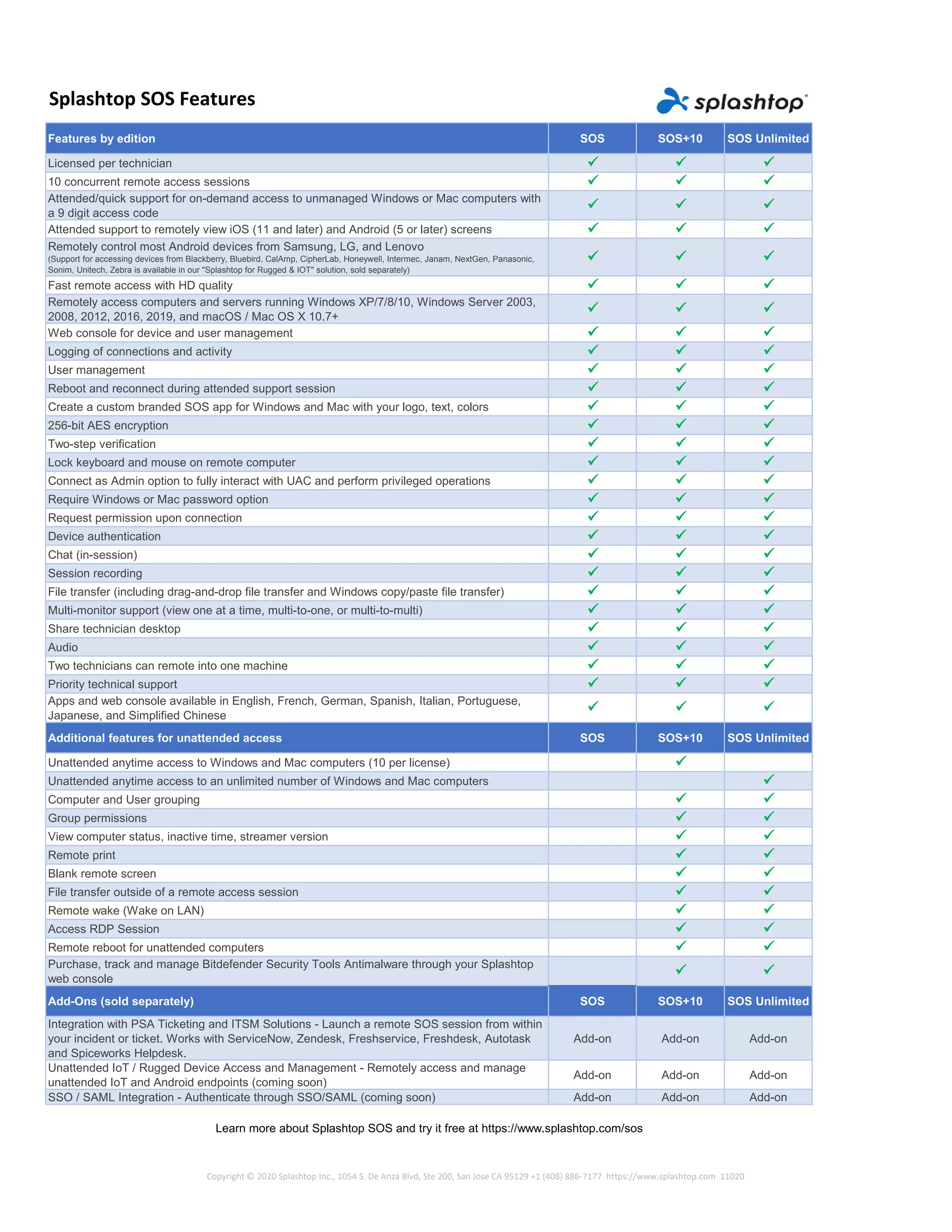 The document summarizes the features of Splashtop SOS, a remote support software. It lists features included in the SOS, SOS+10, and SOS Unlimited editions, such as the number of concurrent remote access sessions, remote access and control capabilities for Windows, Mac, and Android devices, security features like encryption, and management features like user management and activity logging. It also outlines additional unattended access features and add-ons available for purchase.