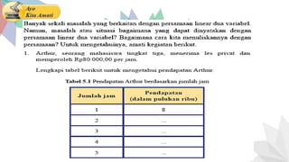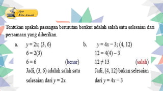 Dokumen tersebut membahas tentang sistem persamaan linear dua variabel (SPLDV), yang merupakan persamaan yang memiliki dua variabel dengan pangkat tertinggi masing-masing variabel satu. Diberikan contoh soal SPLDV dari biaya studi lapangan, kecepatan dan jarak yang ditempuh kereta api, beserta penjelasan dan kesimpulan tentang pengertian SPLDV.