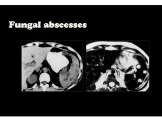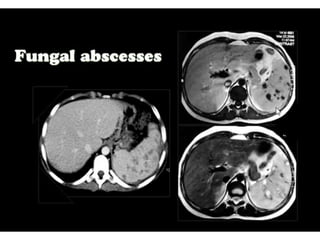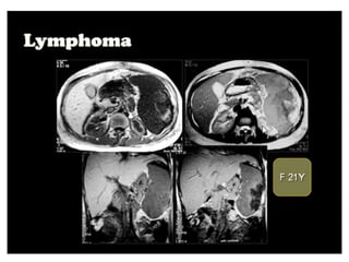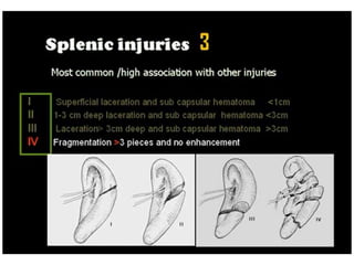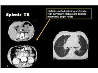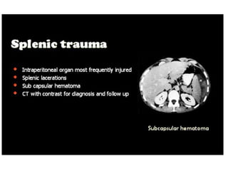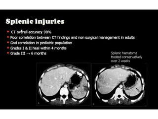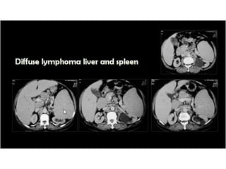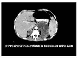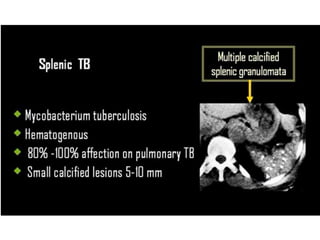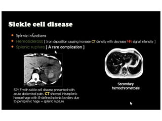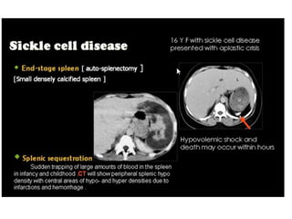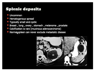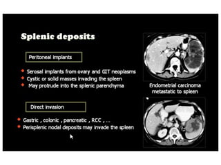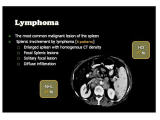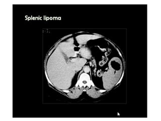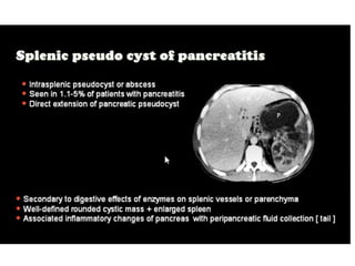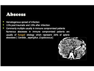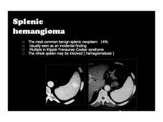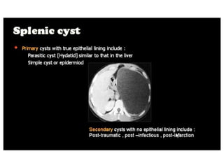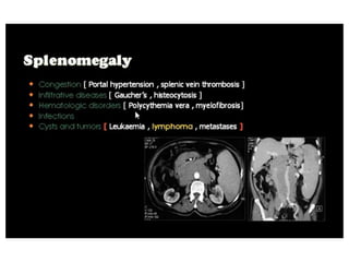 This document discusses the spleen and causes of splenomegaly (enlarged spleen). It begins by thanking radiologists for their assistance. Simple cyst criteria are outlined. Splenogonadal fusion and sarcoidosis are mentioned. The main causes of splenomegaly are then listed, including infections, portal hypertension, hemolytic anemias, hematological malignancies, infiltrative disorders, collagen vascular disorders, and congestive cardiac failure.