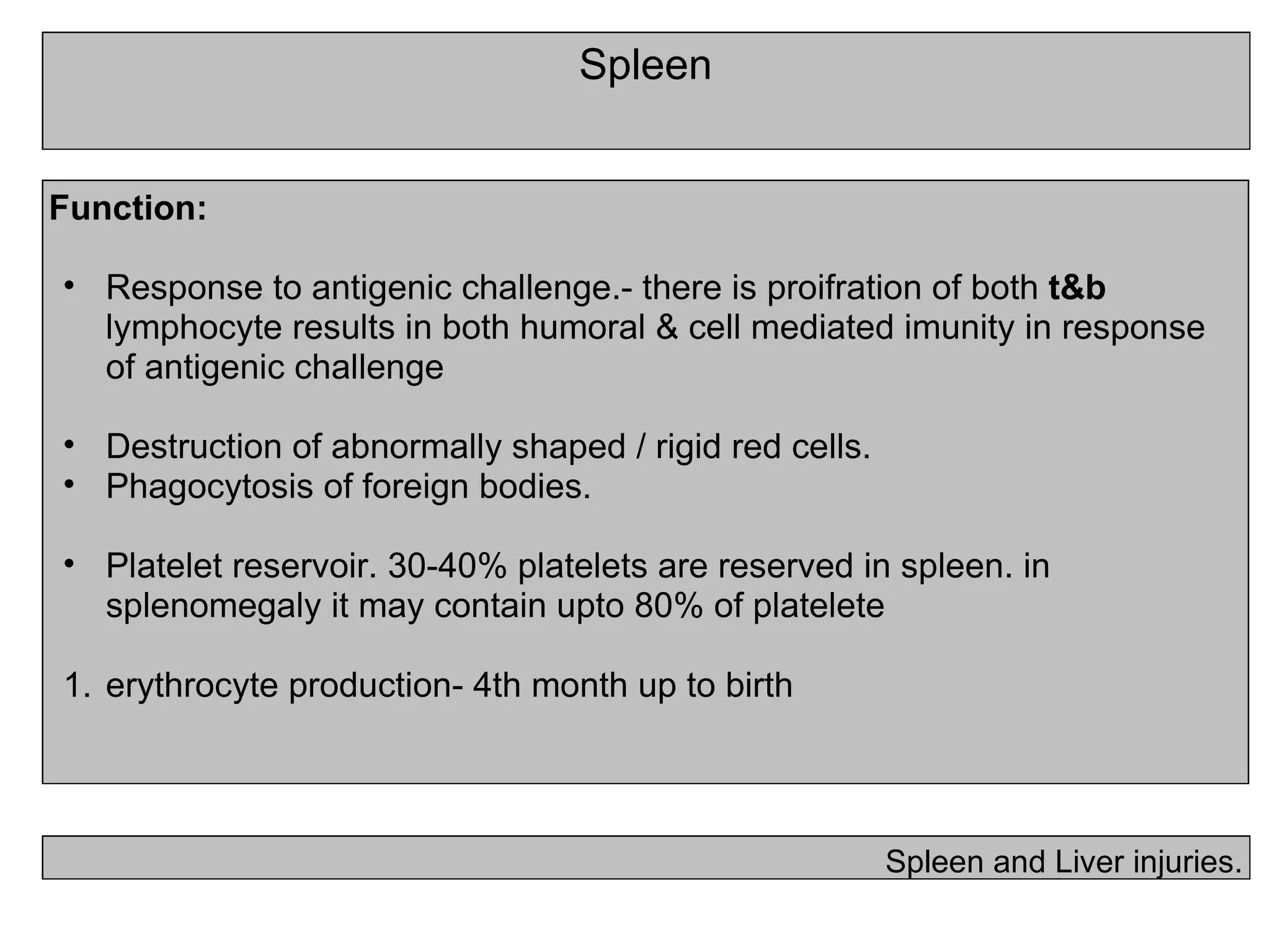 The spleen arises in the embryo and is located in the left hypochondrium between the stomach and diaphragm along the 10th rib. It filters blood, destroys old red blood cells, stores platelets, and mounts immune responses to antigens. Plain radiographs can detect the spleen as a soft tissue shadow while ultrasound and CT scans provide information about its size, shape, and consistency. Radioisotope scans determine position and size when other imaging is inconclusive.