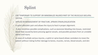 1. Splints are used to immobilize and support injured parts of the musculoskeletal system like fractures, sprains, strains, and dislocations. They alleviate pain and allow injuries to heal properly while minimizing complications.
