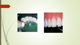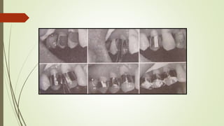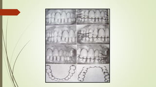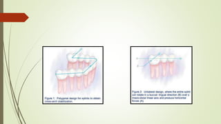 This document provides an overview of splinting as a treatment for stabilizing mobile teeth. It defines splinting and discusses the history, objectives, indications, contraindications, and principles of splinting. It describes different types of splints including temporary, provisional, and permanent splints. Temporary splints are used until mobility is reduced and can include wire ligation, bands, or removable acrylic appliances. The goal of splinting is to decrease tooth movement, distribute forces, and stabilize teeth during and after periodontal treatment.