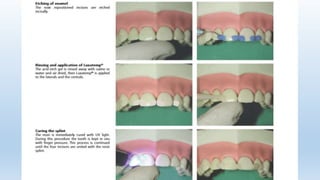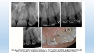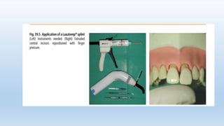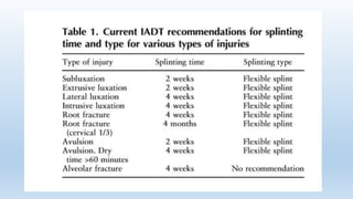 This document discusses splinting of traumatized teeth. It defines splints and their requirements, and describes how splinting influences dental tissues. Different types of splints are described, including composite and wire splints, fibre splints, and titanium trauma splints. Guidelines are provided for splint indications, contraindications, application steps, and recommendations for splint type and duration depending on the specific dental trauma. Factors such as injury classification, healing timeframes, and risk of ankylosis are considered for splint removal timing.