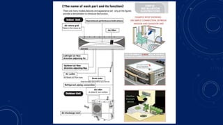 The document discusses split air conditioners. It describes that split air conditioners have an indoor and outdoor unit, with the compressor and condenser located in the outdoor unit. It lists the main types of split AC systems as mini split, multi split, and single split. Multi split systems allow different temperatures for each room controlled by separate indoor units. The document discusses benefits of split systems like flexibility of installation and reduced duct energy loss. It provides examples of popular brands and capacity sizes for split air conditioners.