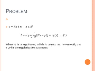 This document proposes a Split Augmented Lagrangian Shrinkage (SALSA) algorithm to solve optimization problems involving sparsity-promoting regularization terms. It uses variable splitting to separate the data fidelity and regularization terms, and then applies an augmented Lagrangian method with soft-thresholding updates to iteratively minimize the overall cost function. Previous related approaches like iterative soft thresholding, two-step iterative soft thresholding, and fast iterative soft thresholding are also discussed.