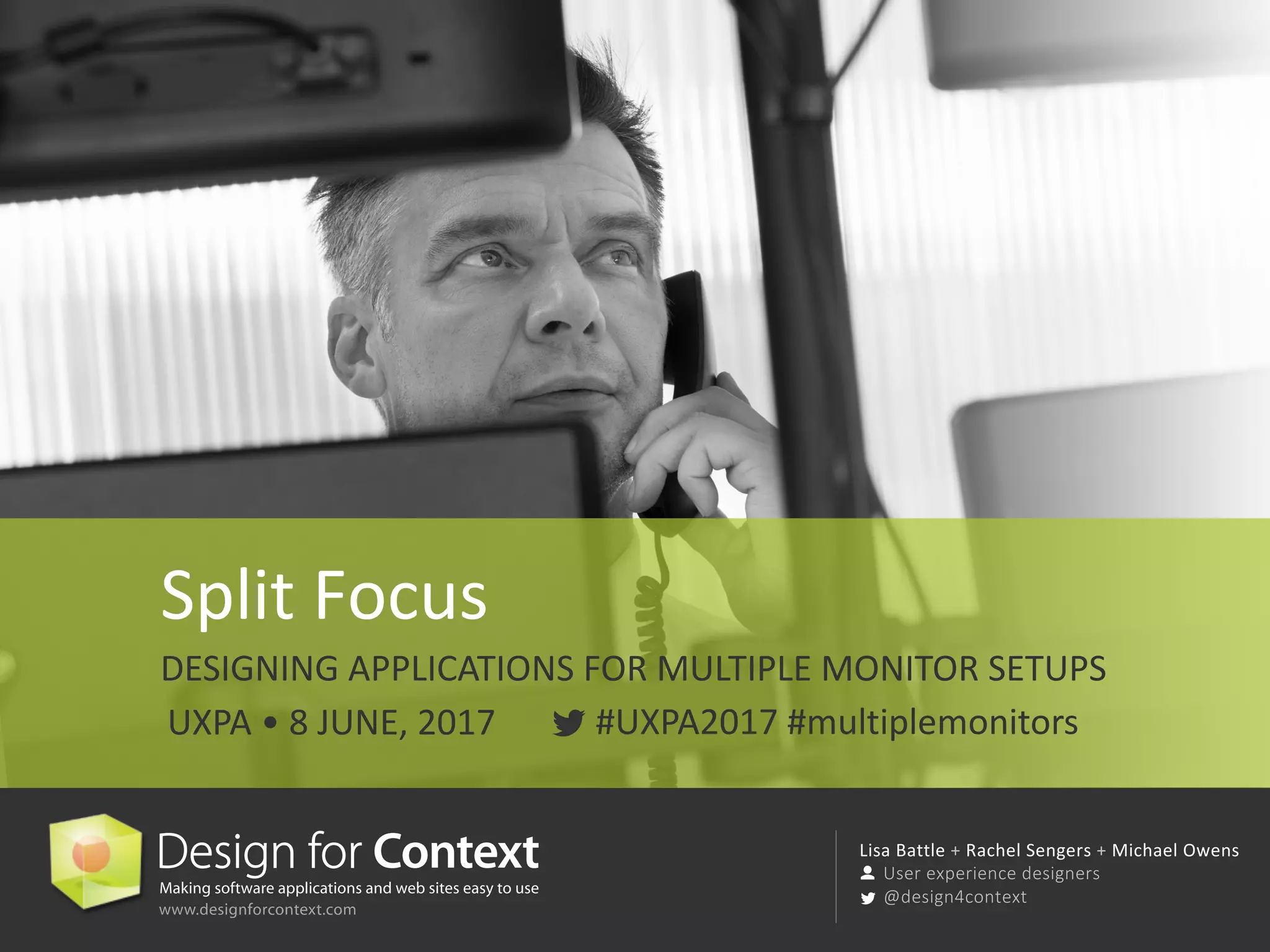 This document summarizes a presentation about designing applications for multiple monitor setups. It discusses challenges with pointing and navigation across monitors, as well as productivity benefits. It provides design principles like organizing windows, providing global navigation, and letting users decide window behaviors. Examples demonstrate automatic window placement, signposting, and notifications to keep users aware of updates even when windows are not visible.