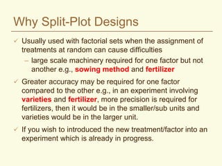Split-plot designs are used in experiments where one factor requires larger plots due to practical constraints, allowing for greater accuracy in treatment application. This design assigns treatments randomly to main plots and smaller subplots, addressing different precision requirements and operational efficiencies. While they enable the introduction of new factors and make efficient use of space, split-plot designs also complicate statistical analysis, as they introduce two sources of experimental error, with main plots typically having lower precision than subplots.