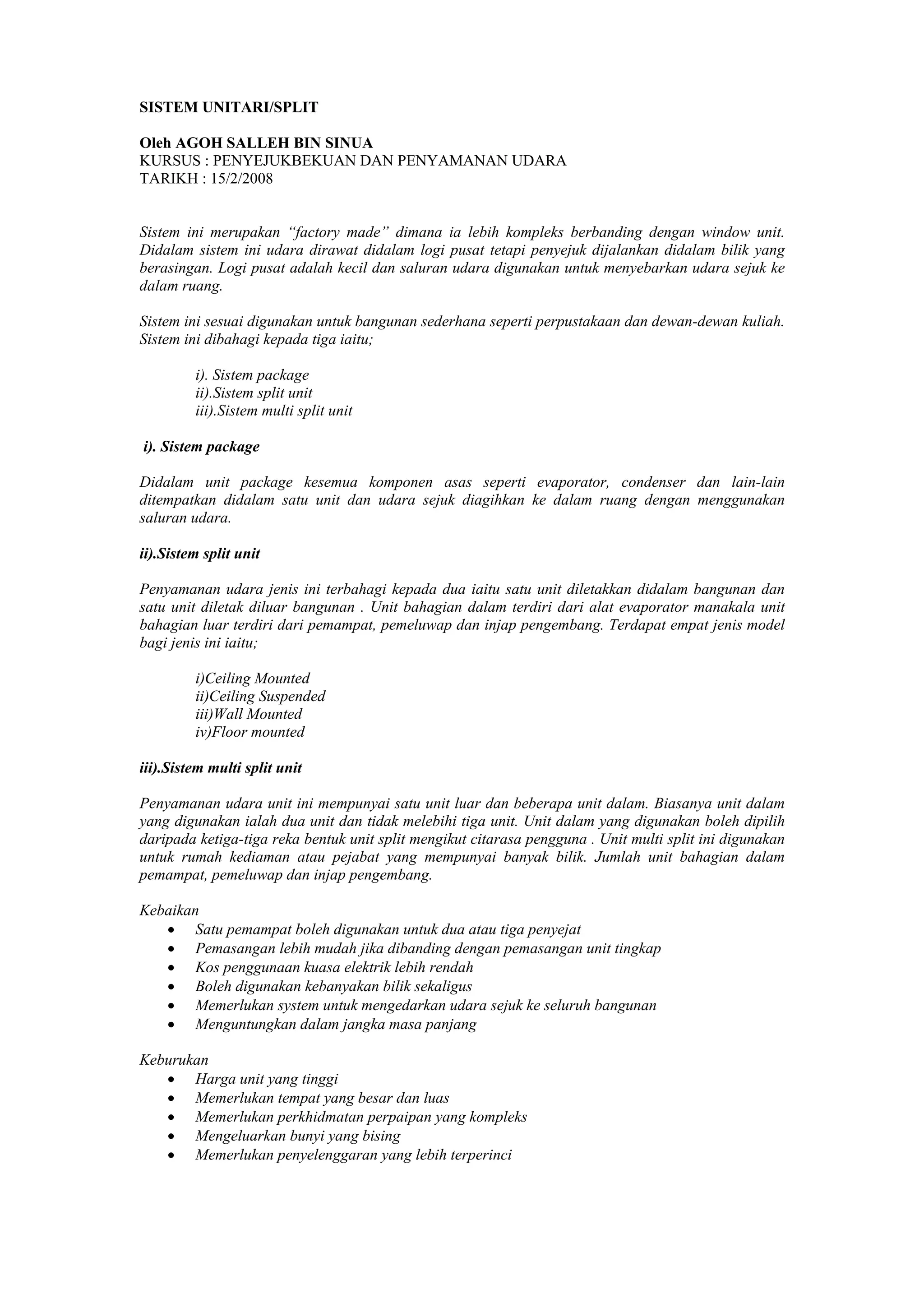 Dokumen ini membincangkan sistem penyejukbekuan dan penyamanan udara yang terdiri daripada tiga jenis: sistem package, sistem split unit, dan sistem multi split unit. Setiap sistem mempunyai kelebihan seperti kos penggunaan kuasa elektrik yang lebih rendah dan kemudahan pemasangan, tetapi juga mempunyai keburukan seperti harga yang tinggi dan keperluan penyelenggaraan yang lebih terperinci. Sistem ini sesuai untuk bangunan bersaiz sederhana dan dapat digunakan di pelbagai bilik dalam kediaman atau pejabat.