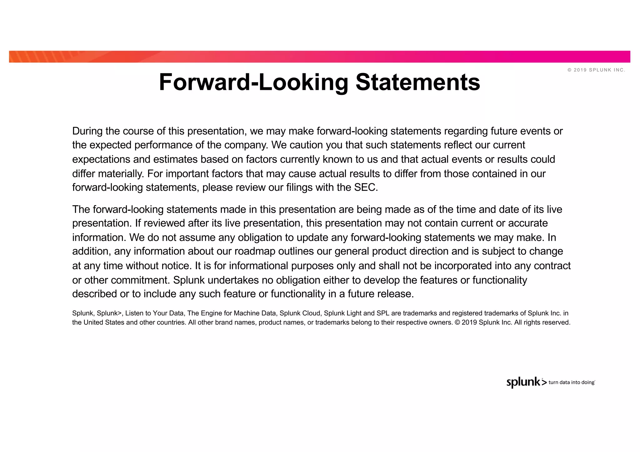 The document is a presentation from a Splunk roundtable discussing the integration of artificial intelligence (AI) and machine learning (ML) within their platform, along with customer use cases and a live demo of the machine learning toolkit. It emphasizes the importance of data analysis, the application's capabilities in anomaly detection, and highlights Splunk’s Machine Learning Toolkit (MLTK) designed for users including data scientists. Forward-looking statements regarding the future of these technologies and their application within Splunk are also included, stressing the need for expertise in machine learning and data preparation.