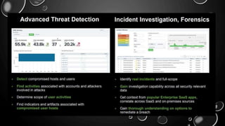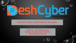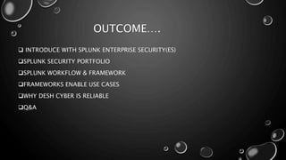 This presentation introduces Splunk Enterprise Security (ES) and its security portfolio. It discusses Splunk's workflow and frameworks that enable key security use cases. The frameworks presented include Notable Events, Asset and Identity, Risk, Threat Intelligence, and Adaptive Response. Desh Cyber is highlighted as a reliable partner that provides Splunk-based security solutions along with training and 24/7 monitoring services.