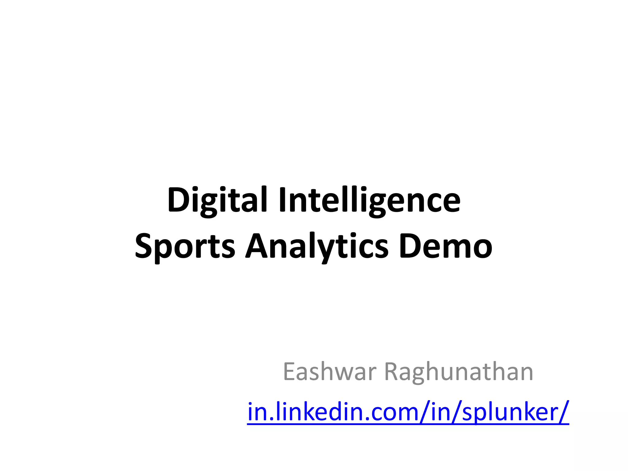 Digital intelligence (DI) refers to the capture, management, and analysis of digital data to provide a holistic view of the customer experience across marketing channels. More than 50% of digital visitors will be via mobile by 2015, so mass TV ads will be less effective. To build a DI framework, an organization should incorporate data from all digital touchpoints, put that data in context with business data, process and store the data in a data warehouse to enable analysis, and use insights to directly impact digital interactions and drive value. The Splunk sports analytics demo shows how an organization can use such a framework to gain insights from sports data.