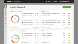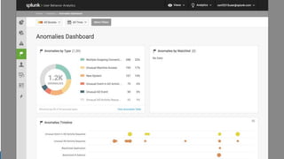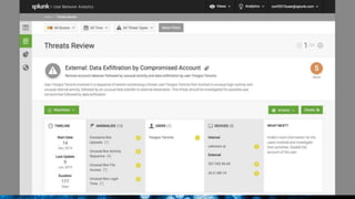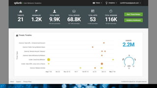 The document discusses security session presented by Philipp Drieger. It begins with a safe harbor statement noting any forward-looking statements are based on current expectations and could differ from actual results. The agenda includes discussing Splunk for security, enterprise security, and Splunk user behavior analytics. It provides examples of how Splunk can be used to detect threats like fraud and advanced persistent threats by analyzing machine data from various sources. It also discusses how threat intelligence can be incorporated using STIX/TAXII standards and open IOCs. Customer examples show how Nasdaq and Cisco have replaced their SIEMs with Splunk to gain better scalability and flexibility.