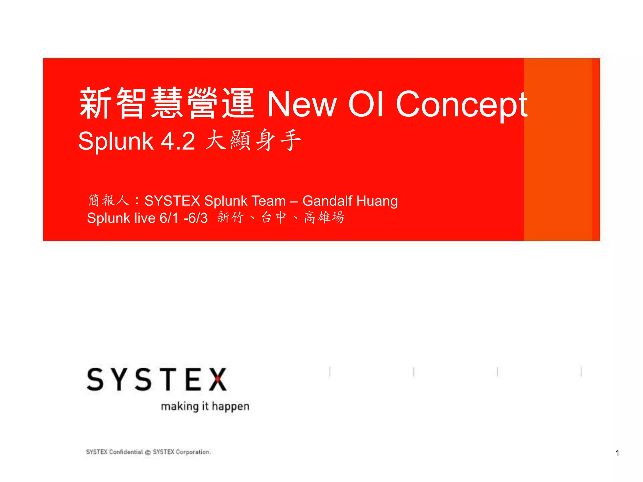 这份简报由Systex Splunk团队呈现,介绍了新智慧营运概念和Splunk 4.2的功能。文中讨论了IT管理的演变,强调了新技术带来的改变与便利。Splunk 4.2提供了即时警报、更快速的数据搜索和跨界管理,旨在提升营运效率与减少成本。