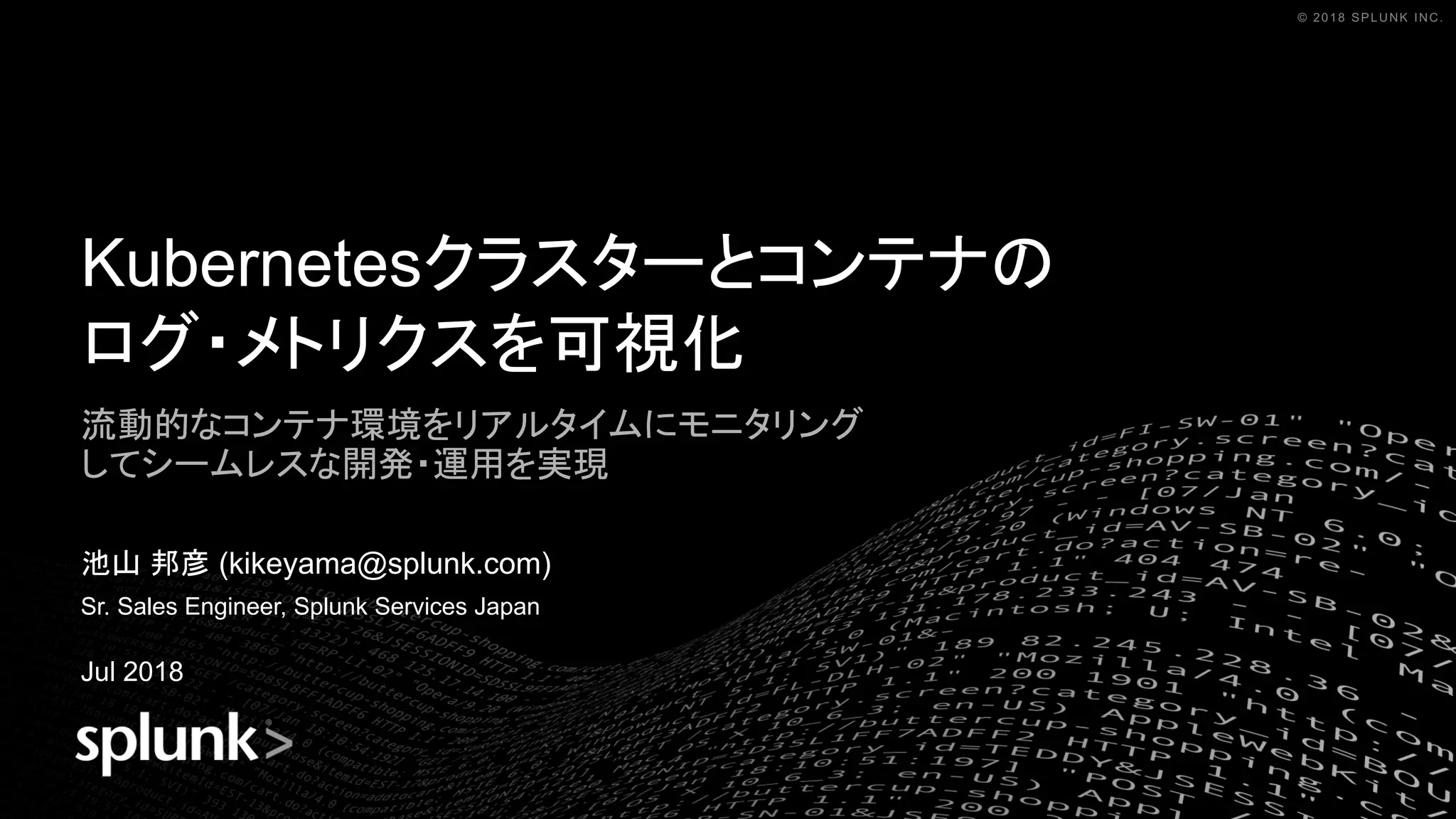 INC.© 2018 SPLUNK INC. Kubernetesクラスターとコンテナの ログ・メトリクスを可視化 流動的なコンテナ環境をリアルタイムにモニタリング してシームレスな開発・運用を実現 池山 邦彦 (kikeyama@splunk.com) Sr. Sales Engineer, Splunk Services Japan Jul 2018