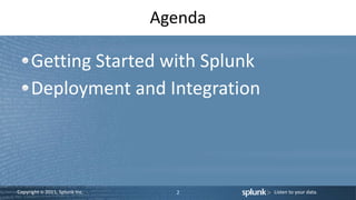 This document provides an overview of Splunk, including how to install Splunk, configure licenses, perform searches, set up alerts and reports, and manage deployments. It discusses indexing data, extracting fields, tagging events, and using the web interface. The goal is to get users started with the basic functions of Splunk like searching, reporting and monitoring.