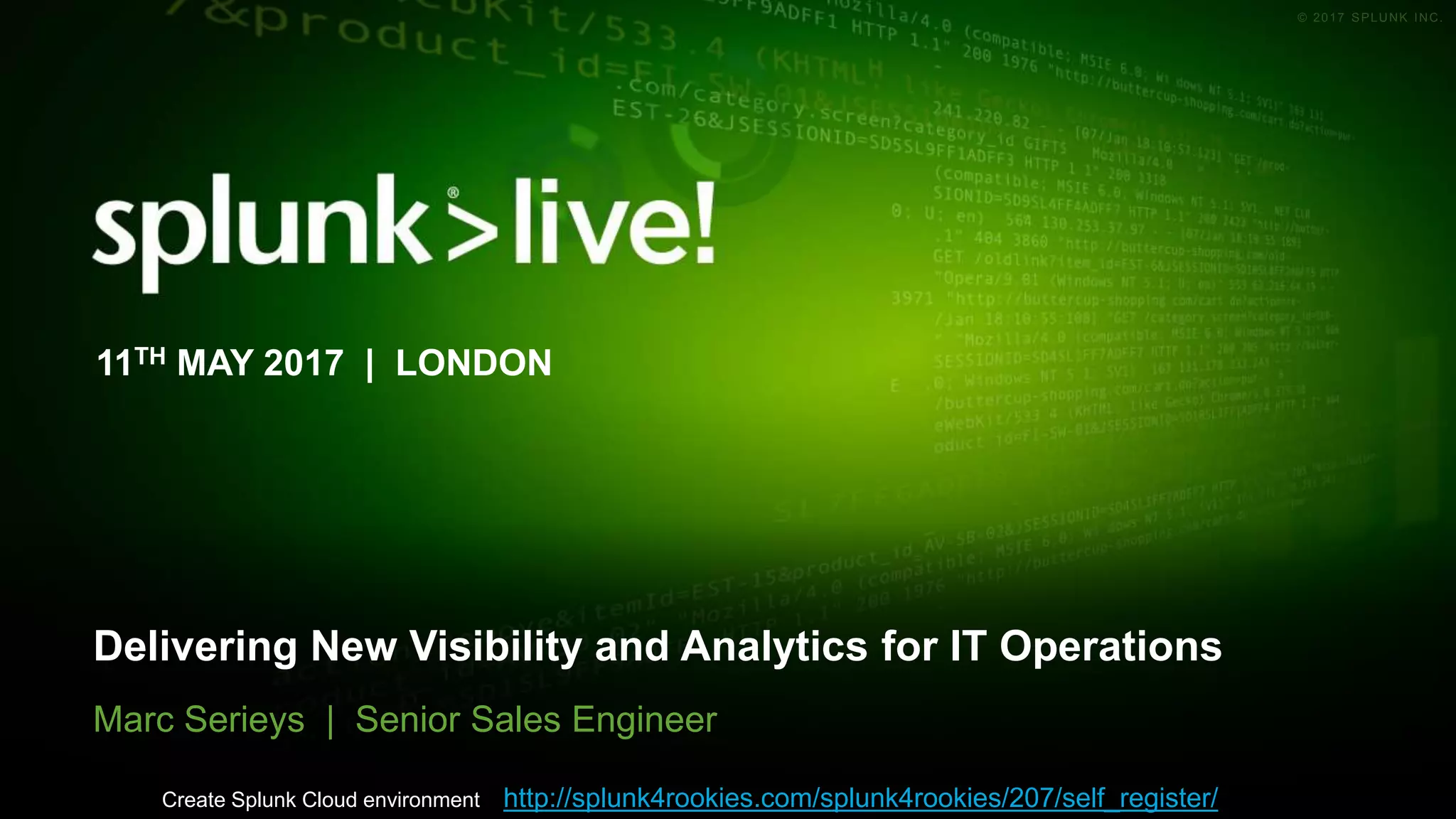 The document outlines Splunk's capabilities in delivering operational intelligence through its platforms, emphasizing insights from machine data and proactive monitoring. It features quick start options for deploying Splunk services, highlights customer success stories, and provides an overview of troubleshooting examples and features. Additionally, it mentions an upcoming Splunk conference in 2017 and resources for further engagement with the Splunk community.