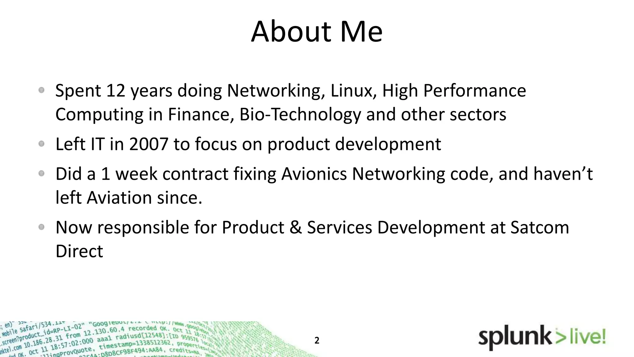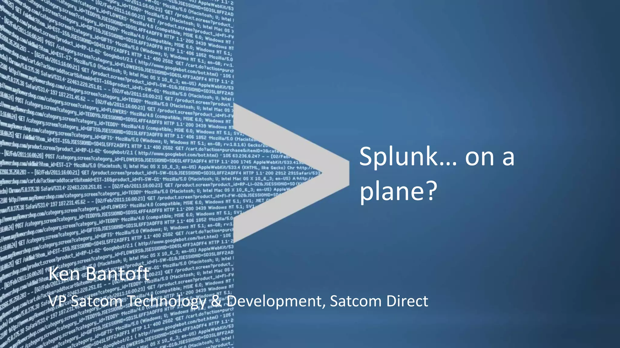 Splunk is used by Satcom Direct for monitoring aviation systems, tracking aircraft in flight, and analyzing business data. Logs from networking devices, phone systems, satellite communications systems and aircraft position reports are fed to Splunk. This allows Satcom Direct to provide a single dashboard for support technicians to monitor systems, see customer information and receive alerts. Splunk is also used to visualize aircraft flight paths on maps and analyze business metrics like call volumes to different countries to improve contracts.