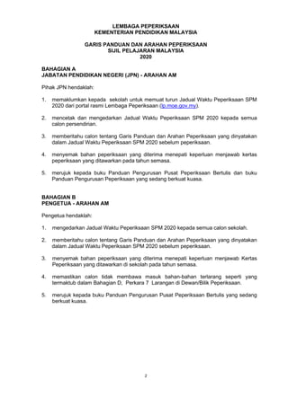 Dokumen ini menjelaskan garis panduan dan arahan untuk peperiksaan Sijil Pelajaran Malaysia (SPM) 2020, termasuk keperluan untuk calon, sekolah, dan pengawas peperiksaan. Calon wajib mengikuti semua peraturan dan memastikan mereka tidak membawa bahan terlarang ke dewan peperiksaan. Tindakan tatatertib akan dikenakan terhadap calon yang melanggar peraturan semasa peperiksaan.