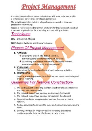The document discusses project management methodologies, focusing on the Critical Path Method (CPM) and the Project Evaluation and Review Technique (PERT), which help in scheduling and controlling project activities. It outlines phases of project management including planning, scheduling, and controlling, as well as guidelines for network construction and the determination of critical paths. Additionally, it provides a practical example of building a hospital with various tasks and their dependencies, concluding with the calculation of the critical path and estimated completion times.