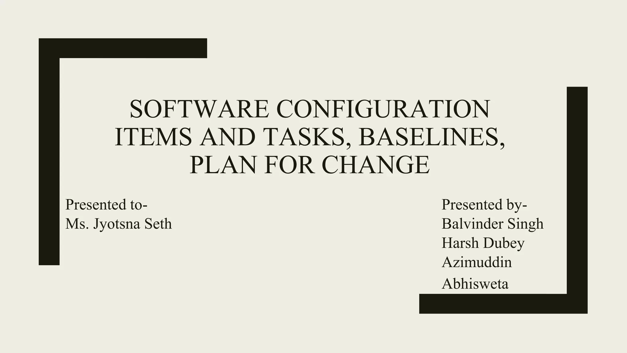 The document discusses software configuration management concepts including configuration items, tasks, baselines, and plans for change. It defines configuration items as any software artifacts subject to change, and tasks as specific work items used to develop and deliver the software. Baselines establish formally accepted versions and are used to measure project progress. A plan for change involves identifying improvement areas and implementing changes to processes, team structure, or technology to enhance project performance.