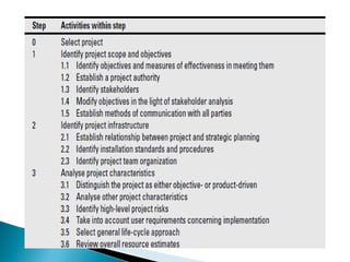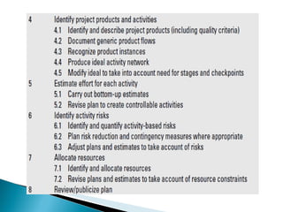 4. Key activities in project management like planning, organizing, staffing, directing, monitoring, and controlling.