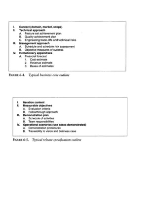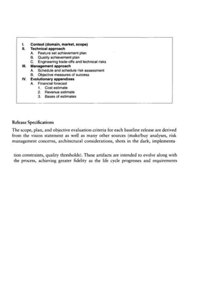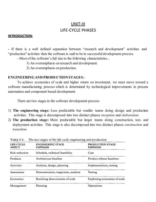 The document discusses the four phases of the software development lifecycle: inception, elaboration, construction, and transition. It provides details on the objectives and essential activities of each phase. The inception phase focuses on establishing scope and demonstrating architecture. The elaboration phase builds prototypes and baselines requirements, architecture, and plans. Construction integrates components and tests features. Transition deploys the software to end users through activities like beta testing and training. The document also discusses engineering artifact sets for managing development, including management, requirements, design, implementation, and deployment artifacts.