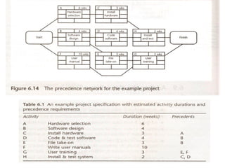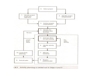 This document discusses activity planning and scheduling for projects. It covers defining activities, identifying activities using different approaches, sequencing activities based on dependencies, and scheduling activities while considering resource availability and allocation. The key steps in developing a project schedule are deciding on activities and their order, creating an ideal activity plan, risk analysis to identify potential issues, and allocating resources which could impact the schedule.