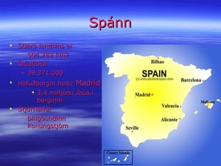 Spánn Stærð landsinser 504.782 km2 Íbúafjöldi 39.371.000 Höfuðborgin heitir Madríd 3,4 milljónir íbúa í borginni Stjórnarfar þingbundinn konungstjórn