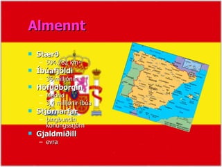 Nokkur orð áspænsku Já ; sí Nei ; no Halló ; hi ! ; hóla Góðan dag; Buenos diás Bless; adios Sé þig seinna; Hasta luego Takk fyrir ; Por farvor Til hamingju með afmælið; Felíz cumpleanos
