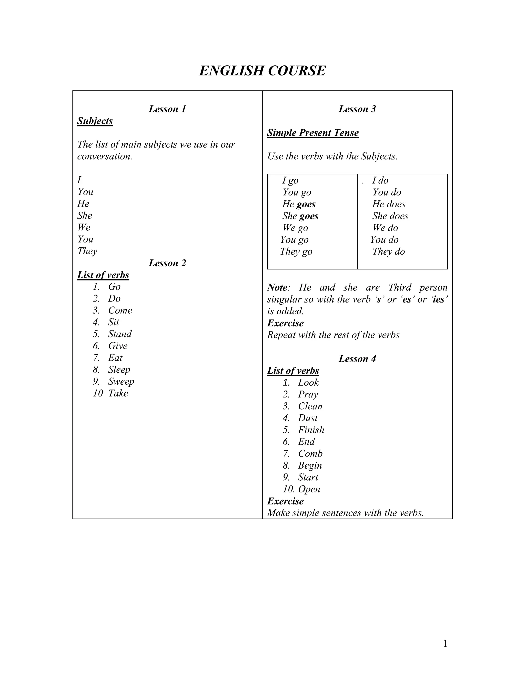 The document provides lessons on the English language, focusing on parts of speech, sentence structure, verb tenses and conjugation. It covers subjects, verbs, simple present tense, questions, negatives, the use of "am/is/are", and defines the components of a basic sentence. The lessons are presented through examples and exercises for students to practice forming sentences in English.