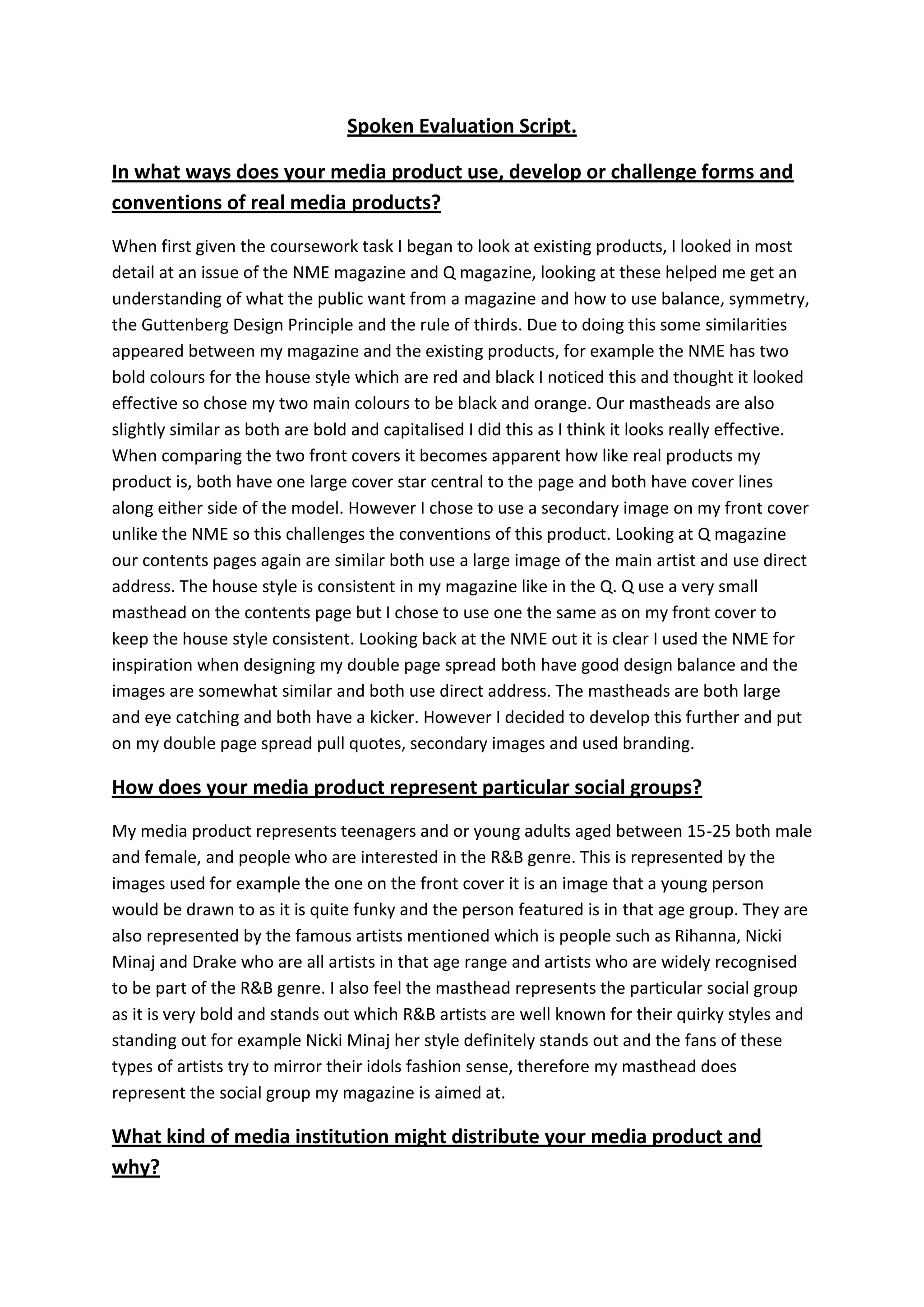 The document discusses the process of creating a magazine as a class project. It examines how the student drew inspiration from existing magazines like NME and Q, modeling aspects of layout, design and conventions. Research was also conducted to determine the target audience would be teenagers and young adults interested in R&B music. Photoshop skills were developed in editing photos to make them brighter and more vibrant. Overall the student felt their final magazine looked professional and was pleased with the photography, though would make some minor changes if doing it again.