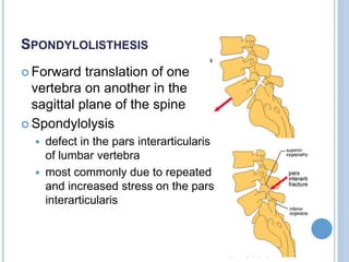 This document discusses spondylolisthesis, including its anatomy, classification, natural history, and management. Some key points include: