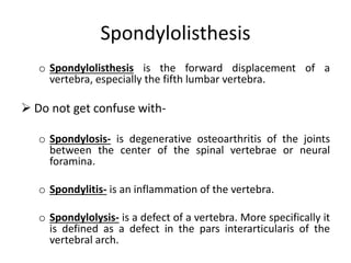 Spondylolisthesis is the forward displacement of a vertebra, most commonly the fifth lumbar vertebra. It occurs when a vertebra slips out of proper position due to a fracture, birth defect, injury, or arthritis which causes abnormal wear on bones and cartilage. Spondylolisthesis is classified based on its cause as isthmic, degenerative, traumatic, or dysplastic and is graded based on the percentage of vertebral slippage. Symptoms include lower back pain, muscle tightness, and pain or numbness in the thighs and buttocks. Treatment options involve conservative measures like physical therapy or surgery.