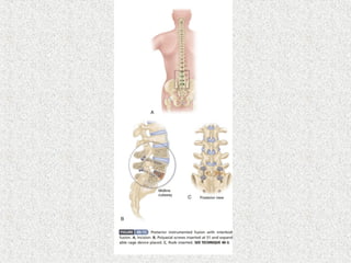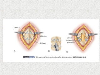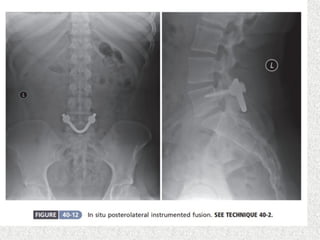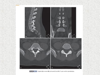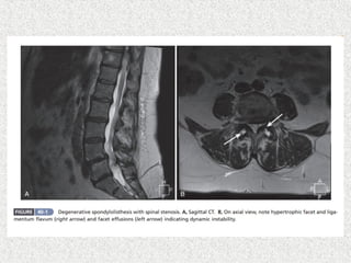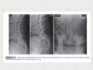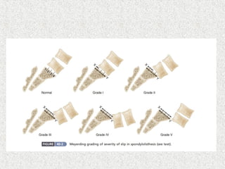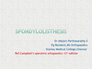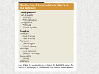 Spondylolisthesis is the anterior displacement of one vertebra over another and is usually caused by the failure of anatomical structures like facets or the posterior bony arch. It is most commonly seen at L4-L5 and L5-S1 levels. Symptoms include axial pain, neurogenic claudication, and radiculopathy. Treatment depends on the degree of slip and presence of neurological symptoms, ranging from conservative management to surgical procedures like fusion either with or without instrumentation.