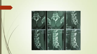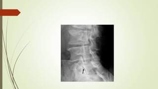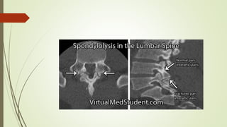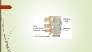 Spondylolysis is a stress fracture of the vertebra's pars interarticularis, which can lead to vertebral slippage and primarily affects young athletes, especially in sports requiring hyperextension. Symptoms include localized pain and restricted movement, typically relieved by rest, while diagnosis may involve imaging techniques like x-rays and SPECT scans. Management includes pain relief, cessation of aggravating activities, physical therapy, and in some cases, surgical intervention.