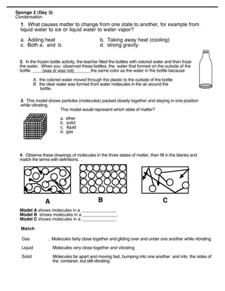 The document is an educational guide covering various concepts related to the water cycle, states of matter, and temperature effects on air. It includes questions and activity prompts for students to identify processes such as evaporation, condensation, and boiling, as well as the behavior of molecules in different states. Additionally, it discusses weather patterns and temperature dynamics in relation to air movement.