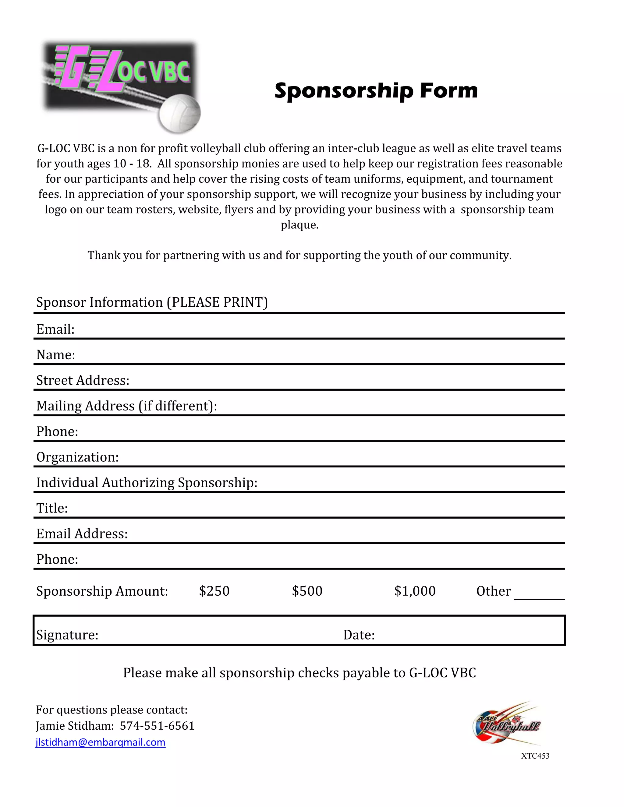 G-LOC VBC is a nonprofit volleyball club offering leagues and travel teams for youth ages 10 to 18. Sponsorship funds will help keep registration fees low and cover costs of uniforms, equipment, and tournaments. In return, sponsors will have their logos included on team rosters, the website, flyers, and receive a sponsorship plaque in appreciation of their support of the youth community. The form collects sponsor information and allows selection of a sponsorship level from $250, $500, or $1000 with checks payable to G-LOC VBC.