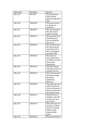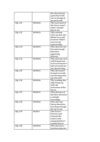 This document contains a list of 149 video clips from a horse jumping sponsorship shoot. Each clip includes the duration and a brief reason for why it was not used, such as issues with framing, focus, movement, or relevance to the sponsorship idea. Many clips were too short, blurry, unsteady, or did not include the proper branding or sportwear. The best clips were used in the final sponsorship video, sometimes cropped or slowed down for effect.