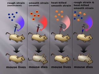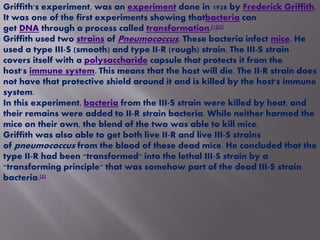 Griffith's experiment in 1928 showed that bacteria can undergo transformation through uptake of DNA. He found that non-lethal heat-killed bacteria, when mixed with live harmless bacteria, could make the mixture lethal. Later it was found the "transforming principle" was DNA, which could be taken up by other bacteria and confer new traits like capsule formation and virulence. This provided early evidence that DNA carries genetic information that can be transferred between bacteria.